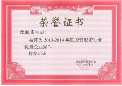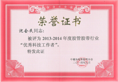 此外,為鼓勵膠管膠帶行業(yè)的廣大企業(yè)經(jīng)營管理者在認(rèn)真貫徹落實科學(xué)發(fā)展觀,推動產(chǎn)業(yè)轉(zhuǎn)型升級等方面的積極貢獻(xiàn),同時為表彰先進(jìn)、樹立榜樣、充分發(fā)揮優(yōu)秀企業(yè)家和科技工作者在行業(yè)發(fā)展中的帶頭示范作用,落實工信部對協(xié)會工作的要求,按照中國橡膠工業(yè)協(xié)會膠管膠帶分會制定的“膠管膠帶行業(yè)優(yōu)秀企業(yè)家評定辦法”和“膠管膠帶行業(yè)優(yōu)秀科技工作者評定辦法”,我公司董事長沈耿亮被評為“2013-2014年度膠管膠帶行業(yè)優(yōu)秀企業(yè)家”,總經(jīng)理沈會民被評為“2013-2014年度膠管膠帶行業(yè)優(yōu)秀科技工作者”。